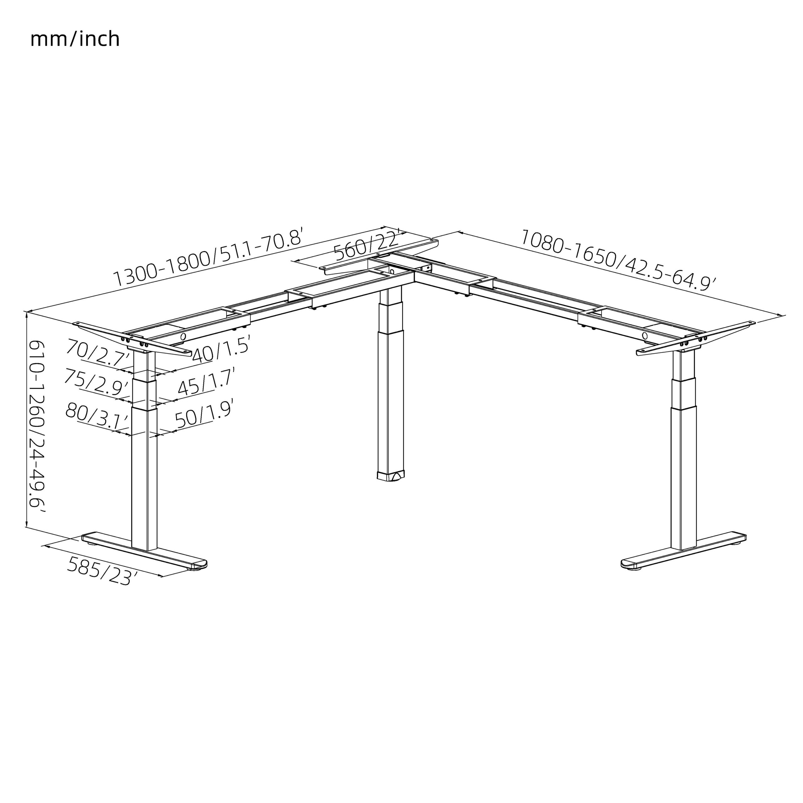 Mit großzügiger Arbeitsfläche auf zwei Seiten (links 1300–1800 mm, rechts 1080–1650 mm) und einer Tiefe von 560 mm bietet er Platz für Produktivität in modernem Design.