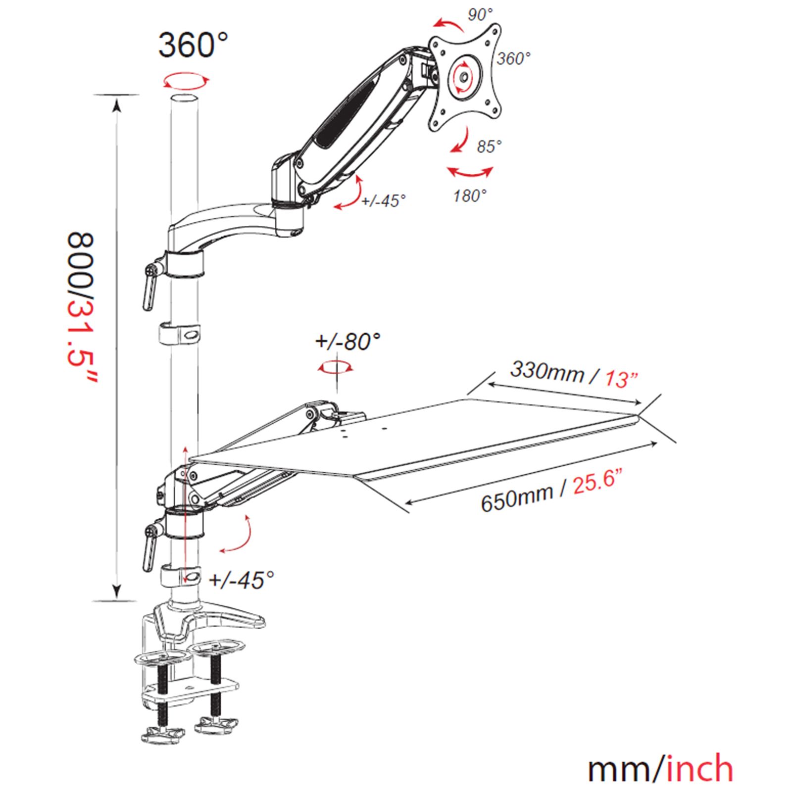 Belastbarkeit: bis zu 8 kg je Monitor – 360° drehbar, 180° schwenkbar – höhenverstellbar und +85° /-90° neigbar