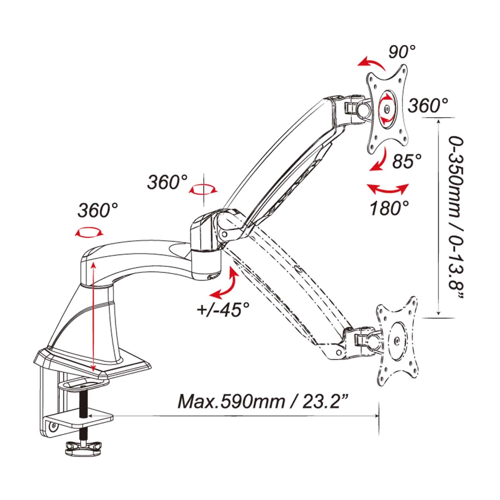Mit Hilfe einer Einstellschraube, kann man die Haltekraft auf das Gewicht des Monitors einstellen. Nach Einstellung der Gelenkarme ist ein flexibles und Ausrichten ohne erneutes Schrauben möglich. Die Monitorarme arretieren an der gewünschten Position. Danks des Standrohrs können alle Gelenkarme ebenfalls um 360° gedreht werden.