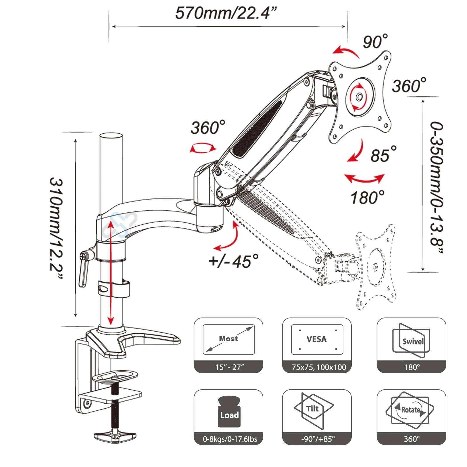 Belastbarkeit: bis 8 kg je Monitor – 360° drehbar, 180° schwenkbar, -90°/+85° neigbar