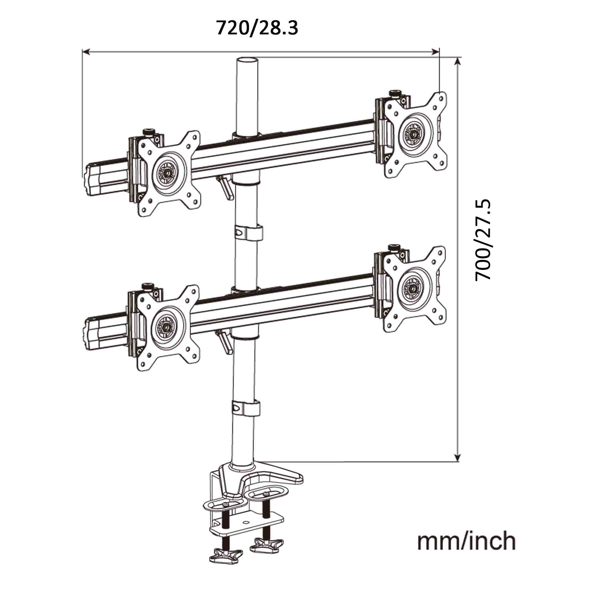- Vierfache Aluminium-Halterung mit 2-Loch-Standfuß für eine absturzsichere und stabile Tischbefestigung
