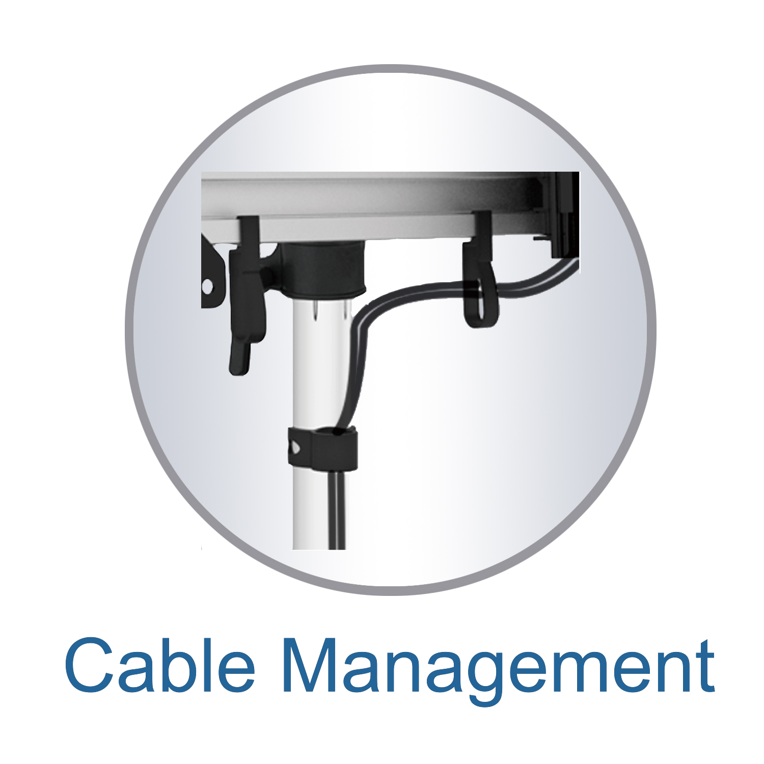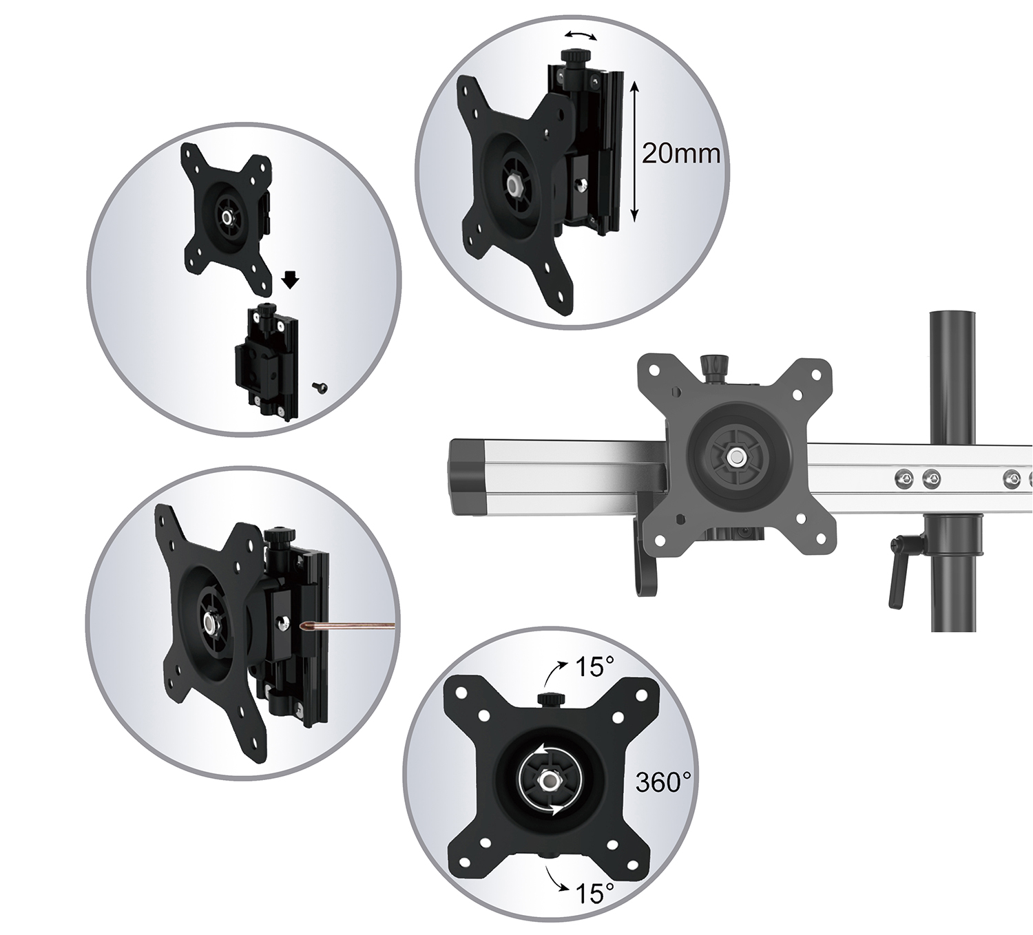 - Variable und stufenlose Ausrichtung des Monitors (vertikal und horizontal)